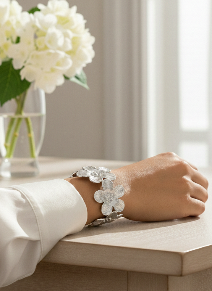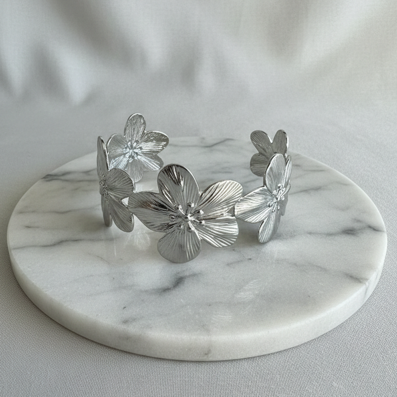 Para quienes prefieren la sofisticación fría y moderna, nuestro brazalete de flor plateado es la elección perfecta. Con un brillo pulido tipo espejo, esta pieza combina la suavidad de las formas florales con la fuerza del metal plateado, creando un equilibrio visual único y contemporáneo.